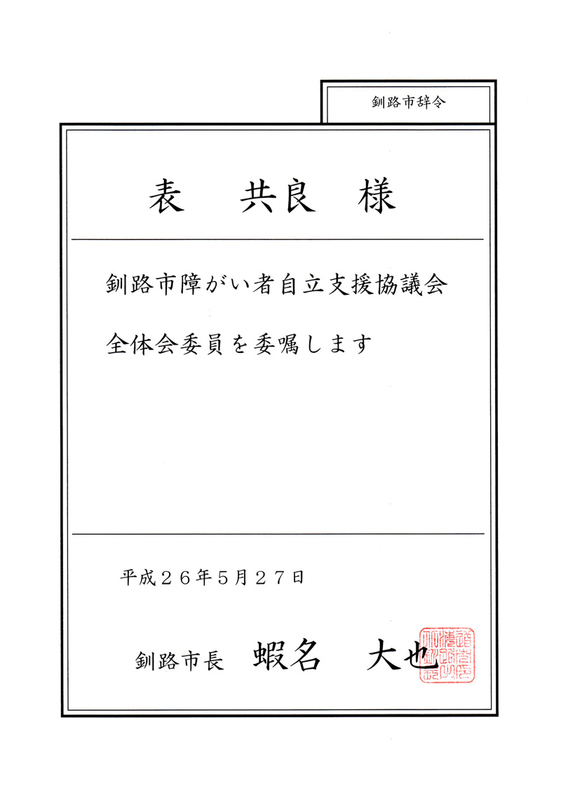釧路市障がい者自立支援協議会全体会委員 委嘱状