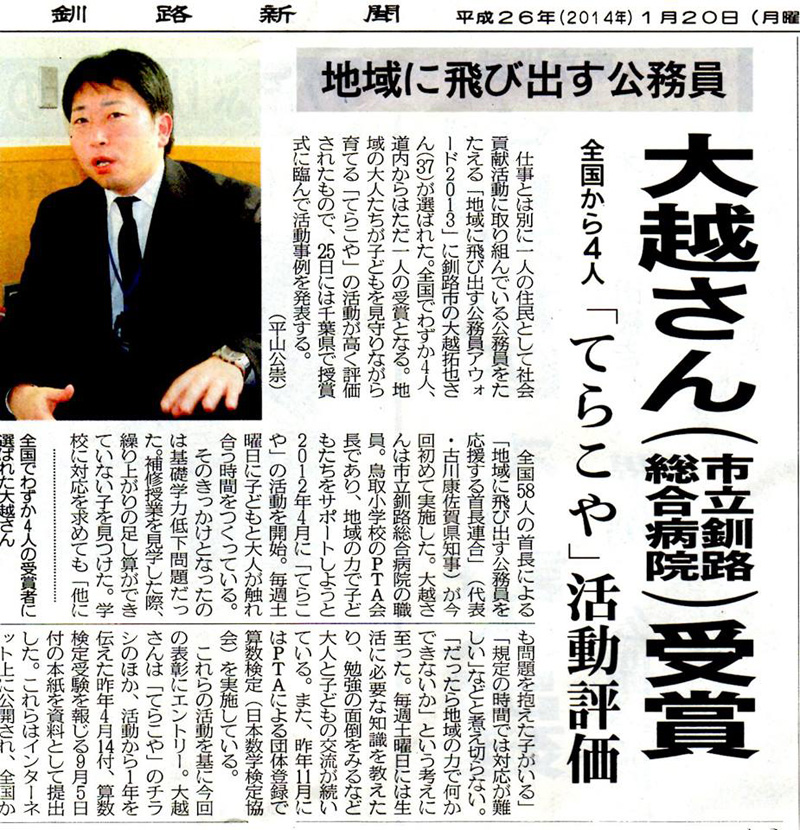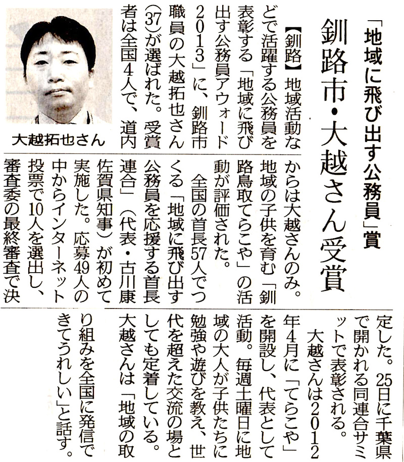 私が応援している大越拓也くんが、なんと‼ 全国から49人の応募の中で受賞者が4人に、道内でただ一人に選ばれました‼皆様の応援とご協力とありがとうございました。感謝地域に飛び出す公務員アウォードhttp://t-k-award.sakura.ne.jp/index.html