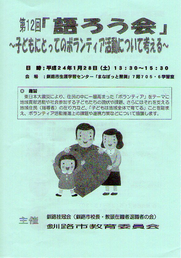 釧路挂冠会(釧路市校長会・教頭在職者退職者の会)と釧路市教育委員会の第12回「語ろう会」〜子どもにとってのボランティア活動について考える〜に出席させて頂きました。