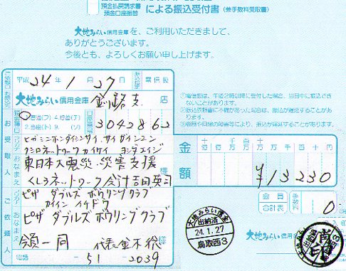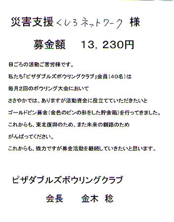 ピザ ダブルス ボウリングクラブ 会長 金木稔様から13,230円 活動支援金として頂きました。 Pizza W's(ピザダブルス) 釧路市鳥取大通5丁目3-19 オレンジビル1階 55-6622 東日本大震災復興のため「災害支援くしろネットワーク」は春に向けて再開に向けて準備中です。 皆様のご協力よろしくお願い致します。 「災害支援くしろネットワーク」http://www.oc-voice.com/946net/