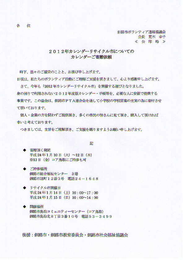 「カレンダーリサイクル市」 カレンダーのご提供