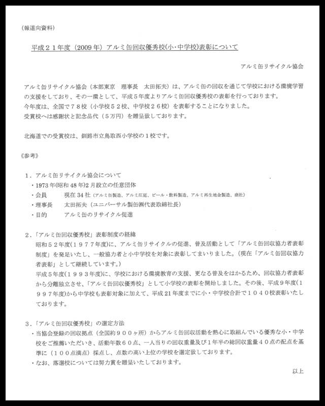 3日に鳥取西小学校で行われたアルミ缶リサイクル協会 回収優秀校表彰式が釧路新聞に載りました。学校を含め福祉施設や町内会や老人会など、古紙を含めて有価物として売却できる資源物を集め、その益金を基に様々な活動資金に出来ます。もっとリサイクルの推進と共に、地域の活性化に繋げる活動の輪が広がることを願っています。