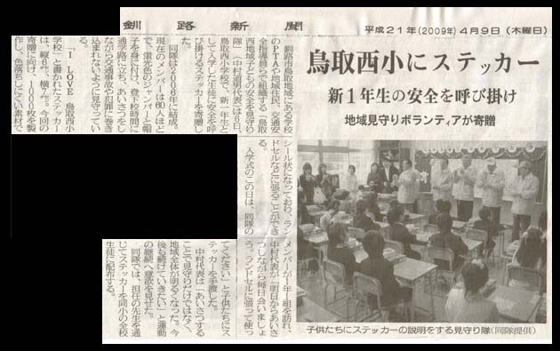 釧路新聞に鳥取西小学校の入学式で「鳥取西地域子どもの安全を見守り隊」の皆さんから【I LOVE 鳥取西小学校ステッカー】を新入生にプレゼントを行った様子が載りました。