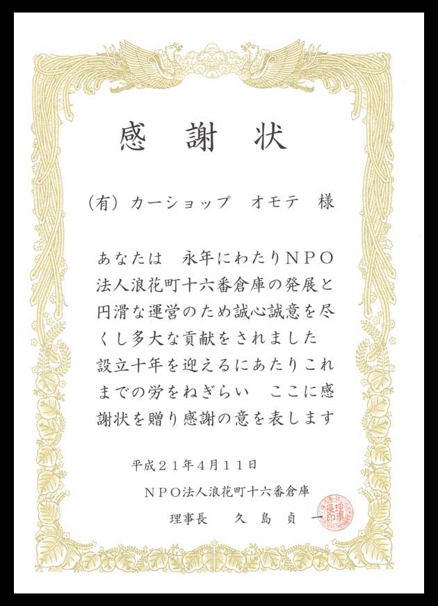浪花町十六番倉庫 第10回目誕生祭で「感謝状」をいただきました。 感謝