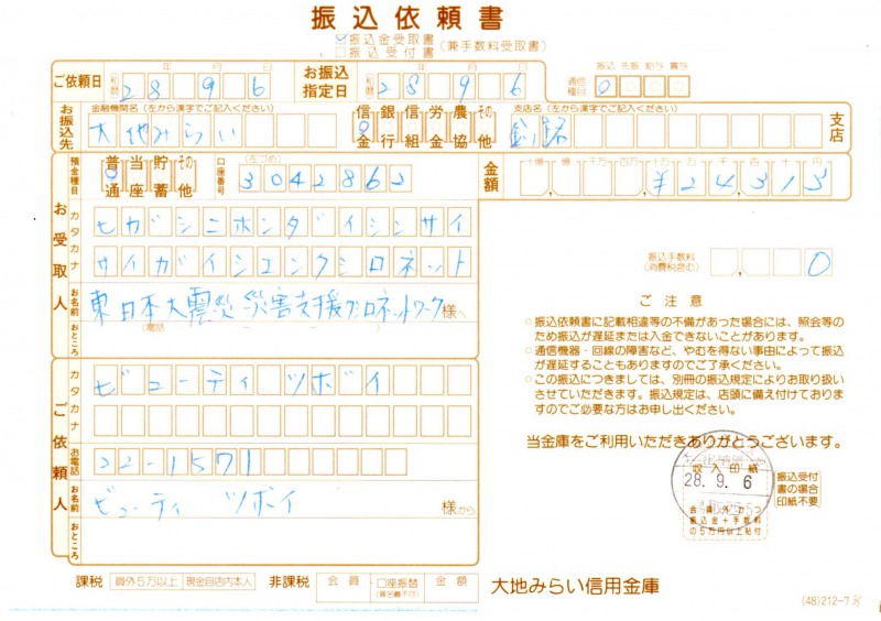 ビューティ ツボイ 「ちびっ子チャリティーカット💛」〜くまもと・おおいたに愛を届けよう!〜で集まった募金24,313円を実行委員の川原久美子さまから受領させていただきました。感謝