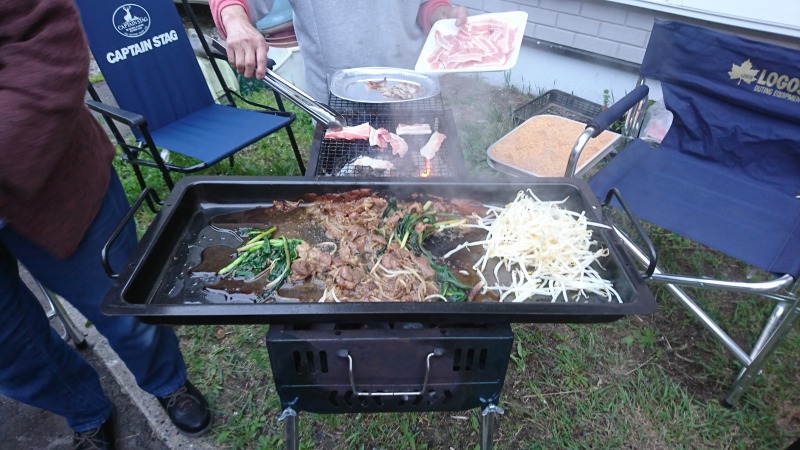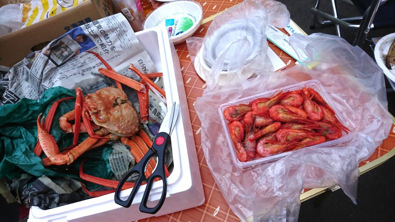 焼き肉の他、和商市場で買った真ホッケ、メンメ、ズワイガニ、お客さんが西港で釣っていただいたコマイ、尾岱沼の弟からもらったシマエビ、鶴丘で採った行者にんにくを用意しました。