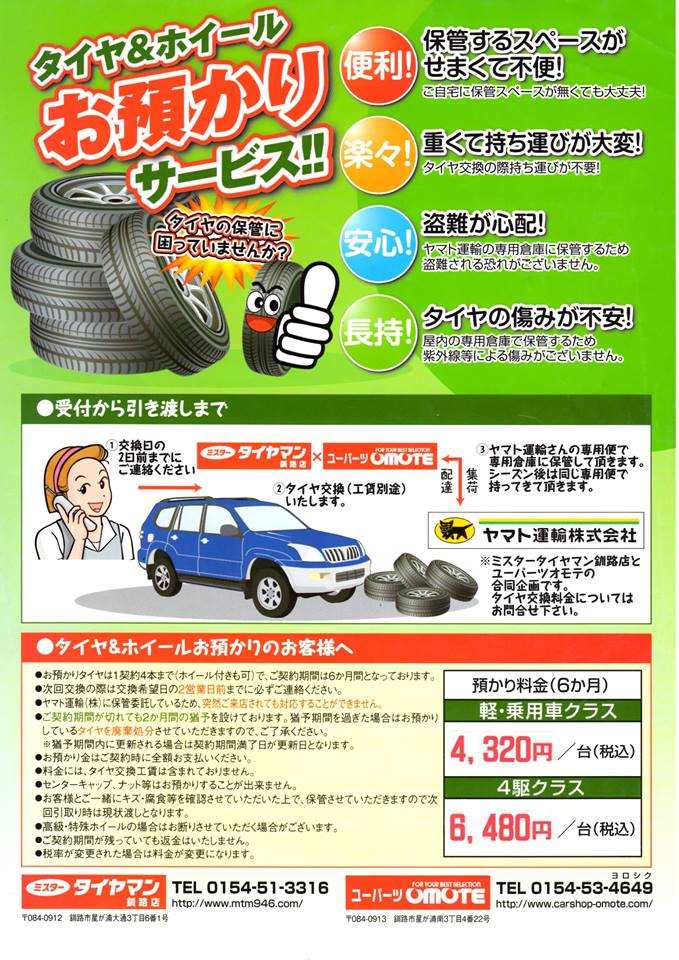 預かり料金(6か月)+猶予期間2か月 軽四輪・乗用車クラス:4,320円(税込み)4駆クラス:6,480円(税込み)※脱着料金は別途かかります。詳細についてはチラシをご確認ください。ユーパーツオモテ 店長 永井宏巳 釧路市星が浦南3-4-22 0154-53-4649http://www.carshop-omote.com/※予約制を取っていますので、ご来店前にご連絡をお願い致します。