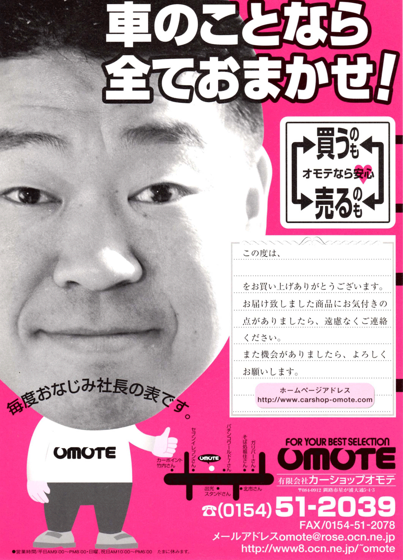 16年前に始めたヤフーオークション(現 ヤフオク)での中古部品販売、顔の見えないお客さんにカーショップオモテを伝えたくて11年前に作ったチラシを発送品の中に入れています。このチラシの効果でしょうか? 当社のHPやネット上のお取引などで、全国各地から当社まで来釧してくれる方がいることを大変うれしく思います。