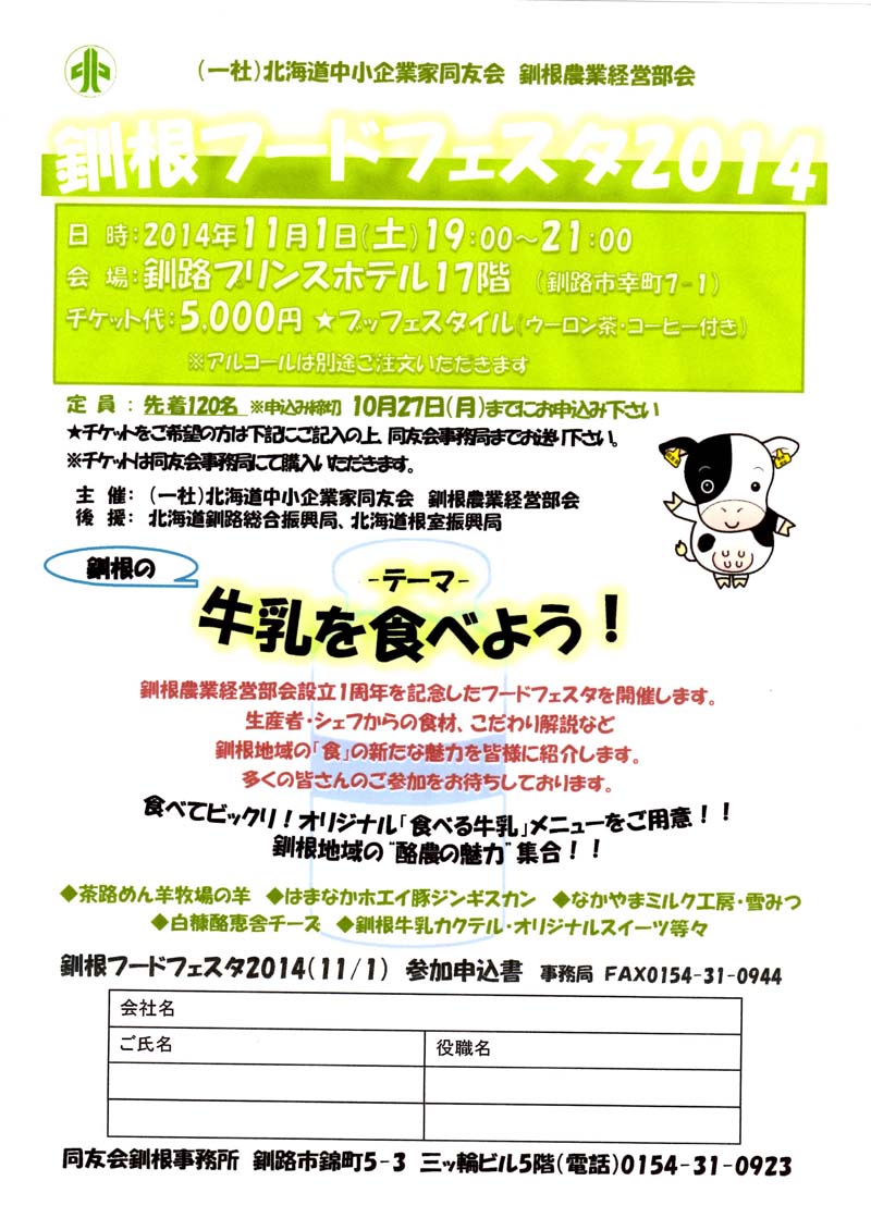 中小企業家同友会 「釧根農業経営部会」の設立1周年を記念したフードフェスタへのお誘いです。