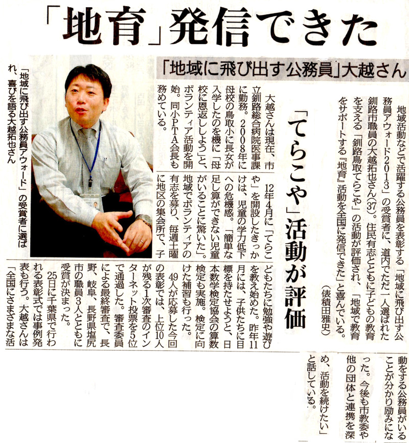 私が応援している大越拓也くんが、なんと‼ 全国から49人の応募の中で受賞者が4人に、道内でただ一人に選ばれました‼皆様の応援とご協力とありがとうございました。感謝地域に飛び出す公務員アウォードhttp://t-k-award.sakura.ne.jp/index.html
