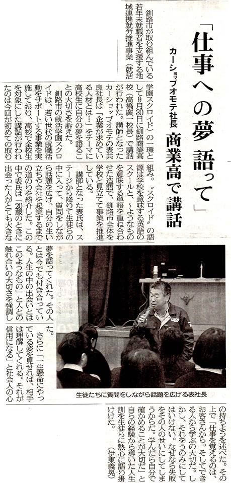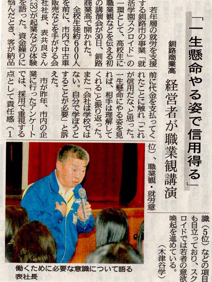 昨日、北海道釧路商業高等学校で行った就職活動支援講演会、新聞で取り上げてくださいました。昨夜 息子に演題の「企業が求める人材とは・・・。」の話しが殆んどなかったと友達が言ってたと・・・。(^^;続きが聞きたい生徒と教職員は、泣Jーショップオモテまで。(*^^)v