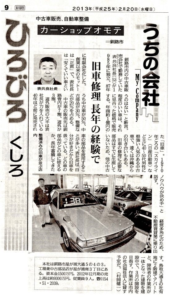 北海道新聞(夕刊)うちの会社に載せて頂きました。今回の取材で12年前にも載せて貰ったことを教えて頂きました!25歳になった翌月の2月28日に貯金の50万円を持って初めて仕事ですが、あと数日で29年目のスタートに立ちます。中古自動車の販売や整備など、多様に変化してますが、これからも人の出会いに感謝して、「正直な商い」を続けて行きたいと思います。車のことなら「オモテ」と言われるように頑張ります。(^^)v