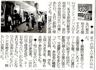 災害支援くしろネットワーク 第26次隊 「復興支援 ボランティアバス」 上川原隊長 30名本日 午後1時出発「途中で3名 合流のため計33名」 5日(金)釜石市での復興支援活動 6日(土)陸前高田市での復興支援活動7日(日)釜石市での復興支援活動 帰 8日(月)22時 釧路KDS 到着予定災害支援くしろネットワークhttp://www.oc-voice.com/946net/