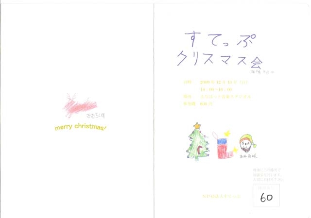 午後2時から生涯学習センター(まなぼっと幣舞)でNPO法人 すてっぷのクリスマス会に、「いちの会」金森会長、浪岡さん、中野さんと私と4人で参加させて頂きました。個性溢れる利用者の皆さんとそのご家族、そして施設を運営する職員の皆さんとサポートする多くのボランティアの皆さんが集まり、楽しいひと時を過ごさせて頂きました。 感謝今後も障がい者の方達との交流を深め、更なる「ノーマライゼーション」の促進に努めたいと思います。