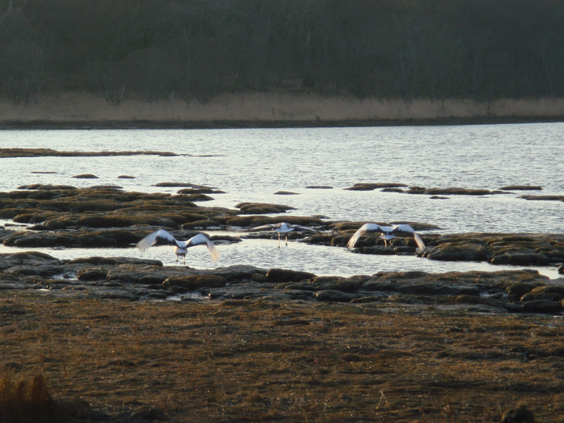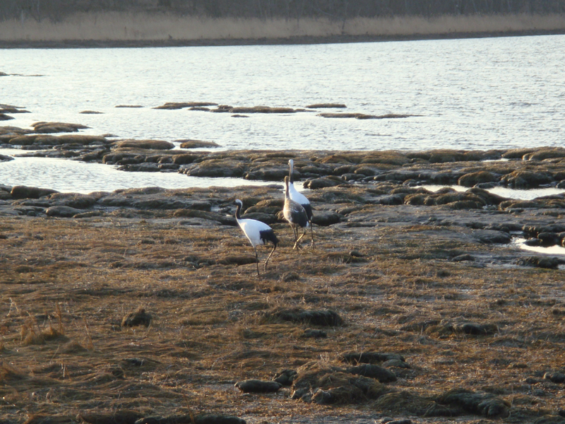 根室市に入ったところの国道そばの海辺で、丹頂鶴の親子が餌を獲っていたのを見つけ、車載車から降りて写真を撮りました。