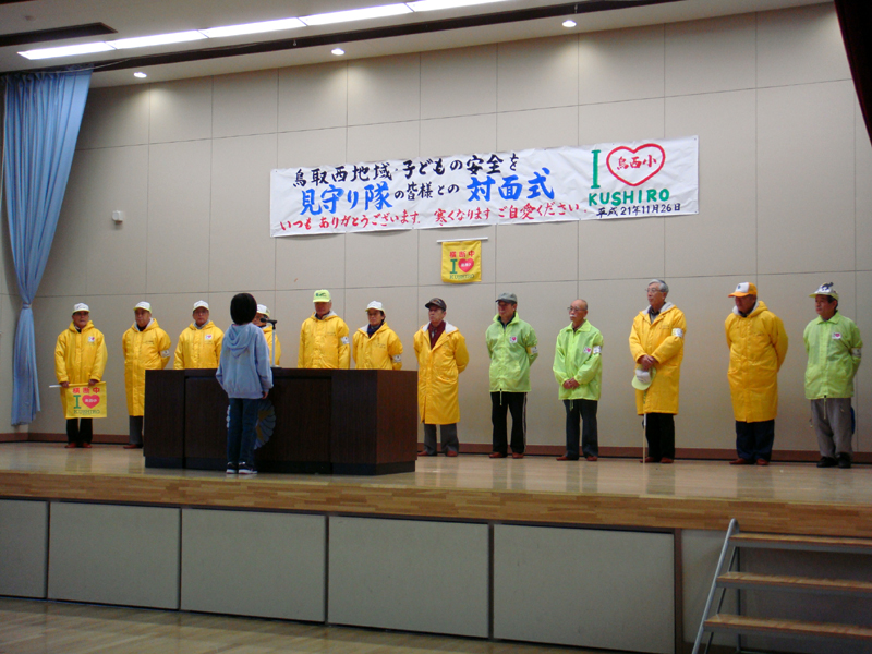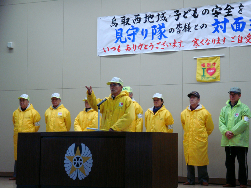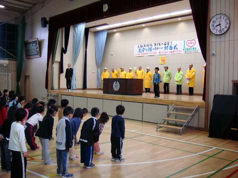26日の朝は鳥取西小学校の朝会に行ってきました。「鳥取西地域子どもの安全を見守り隊」と児童の対面式が行われ、中村隊長さんから児童へ「おはよう御座います」「こんにちは」「さようなら」の挨拶を返してね!との呼びかけがありました。児童らが安全で安心な環境で健全に育むために、地域に暮らす見守り隊の皆さんが協力して下さっている事を、若い世代の大人が感謝すべきだと思います。寒い日も雨の日も本当にありがとう御座います。感謝