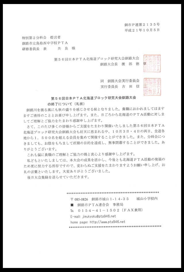 今月初めに開催された「第56回日本PTA北海道ブロック研究大会釧路大会」の終了について(礼状)が届きました。特別第2分科会の提言者として、自分の体験と経験をプロジェクターで画像と共に約40分ほど画像と発表させて頂きました。今後もPTA活動を通して「時代を担う子どもたちの健全な育成」に取り組みたいと想います。