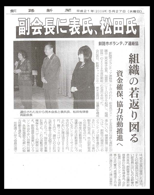 釧路市ボランティア連絡協議会 定期総会で副会長に起用されたことが大きく新聞に載りました。会社を経営することも厳しく又大変ですが、地域社会に貢献することも大切と思っています。誰かが遣ってくれるから・・ではなく、出来るだけ自分が進んで手を挙げ行う努力が大切だと思います。