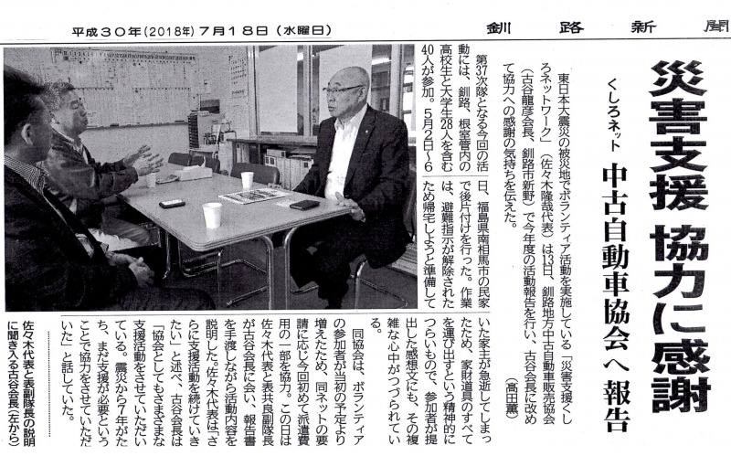 釧路新聞 (7月18日付)JU釧路(釧路地方中古自動車販売店協会)から派遣費用の一部として15万円を助成をいただいたお礼を兼ねて、完成した活動報告書を古谷会長にお渡ししてきました。 JU釧路https://www.jucda.or.jp/kushiro/