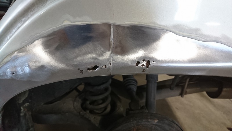 塗装やパテをサンドペーパーで削り落としていくと、錆て穴が開いている箇所が出てきました!