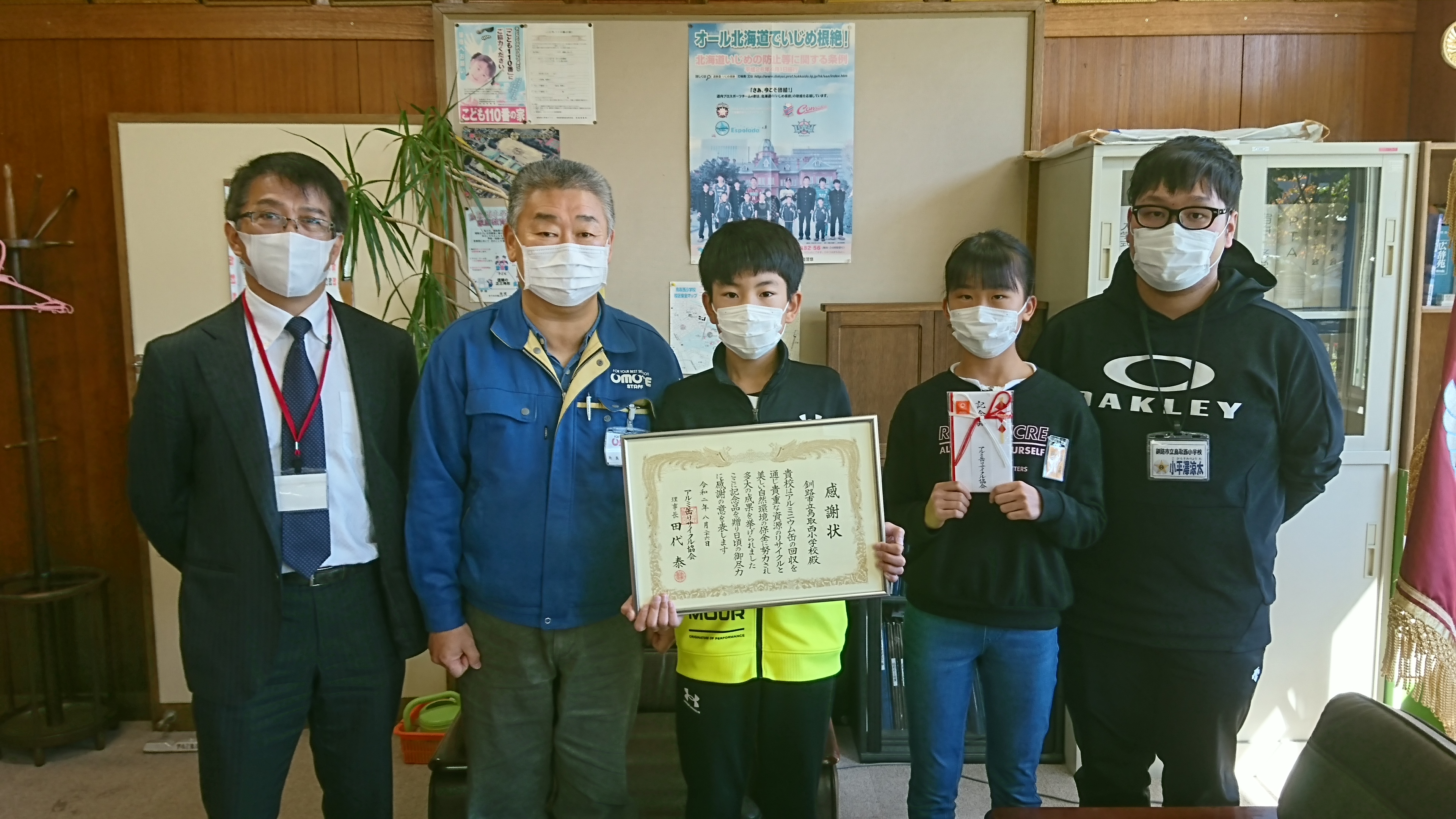 アルミ缶リサイクル協会 2020年度 アルミ缶小・中学校回収協力者表彰 最優秀賞(道内からは一校のみ)の感謝状と副賞(金50,000円)を釧路市立鳥取西小学校に届けてきました。