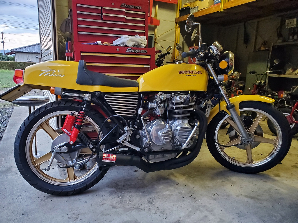 | 「バイク:CB400Fの写真を送っていただきました!!」 【田島様・コメント】 12年前、地元の後輩から譲り受けました。 結構フレームもエンジンも全体的にヤレていましたのでレストアを始めたのですが、バラしていくとフレームのネックと ステップの付け根、サイドスタンドの取り付け部が歪んでいたため フレーム修正に出ました。 エンジンはエンジン番号が無く(削ってある訳でなく当時トラブルで新品のケースに載せ替え)昨今は車検が取れないので、 知り合いのバイク屋さんから貴重な398ccのケースを譲って頂いてシリンダーはヨシムラピストン455ccで傷だらけ(ヘッドガスケット反対組みカムチェーンでヘッドガスケットを削り)使えない状態 オークションで中古の398ccシリンダーを買いアゲイン455ccで組みました。 塗装、内燃機加工、リヤショックオバーホール作業以外は自分で仕上げましたので、1年かかりました。 自分でエンジンオーバーホール調整、ホークオーバーホール、ブラスト、磨き上げフレームに組付けキャブレターセッティングその他 自分で仕上げたので思い入れはありますね。 「譲り受けた時のスペック」 ・ヨシムラ 455ccボアアップ ・BEET キャストホイール ・BEET バックステップ ・モトコ シングルシート ・マルゾッキ ショック ・シビエ 凹みレンズヘッドライト ・ヨシムラ 手曲げ管(当時物) 「現在のスペック」 ・アゲイン 455ccボアアップ ・アゲイン S1カムシャフト ・ヨシムラ TMRキャブレター ・ウオタニSP 点火システム ・ハヤシ キャストホイール ・BEET バックステップ ・モトコ シングルシート ・マルゾッキ ショック ・スキャン アールフィンカバー ・シビエ 凹みレンズヘッドライト ・ヨシムラ 手曲げ管(当時物) ・キジマ オイルクーラー ・BRC CJタイプフロントフェンダー |
